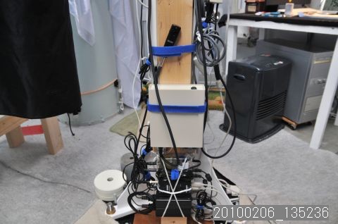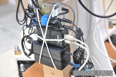これで残りの作業は配線です。パソコンからはWebカメラ、ルクバト、デジイチのUSBのラインが3本です。パソコンはドームの壁においてあり、 RS232C9Pシリアルでモータードライブと接続しています。これが4本になるのを避けるには、パソコンから1本で赤道儀まで持ってきて、USBHUB を使って分岐させることです。色々なサイズの中継用のUSBケーブルを注文してありましたので、無駄に配線を縛ることなく、信号線を配置できました。 USBからの電源を使えるので、電源線を引き回さないで済みました。