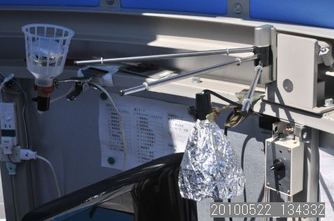 問題はディスプレイの明るさにあります。これ以上暗くはならないので、画面にスモークの入ったアクリル板を取り付けて更に減光させると共に、作業台に被いを付けることにしました。この被いを丈夫に完全に付けてしまうと40センチを使う時に邪魔になりますし、簡単に取り外しが出来るようにしたいと思っていました。そこで、台所にあるふきん掛けを付けて被いをその上に載せようという考えになりました。ふきん掛けは1番大きなものでもアームの長さが足りませんでしたので、延長用のパイプを取り付けました。強度的には「ふきん掛け」ですから、今後改良の余地があります。